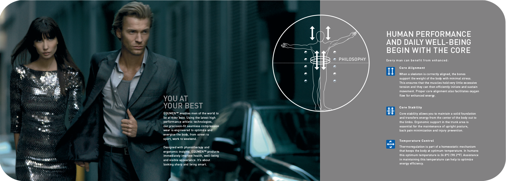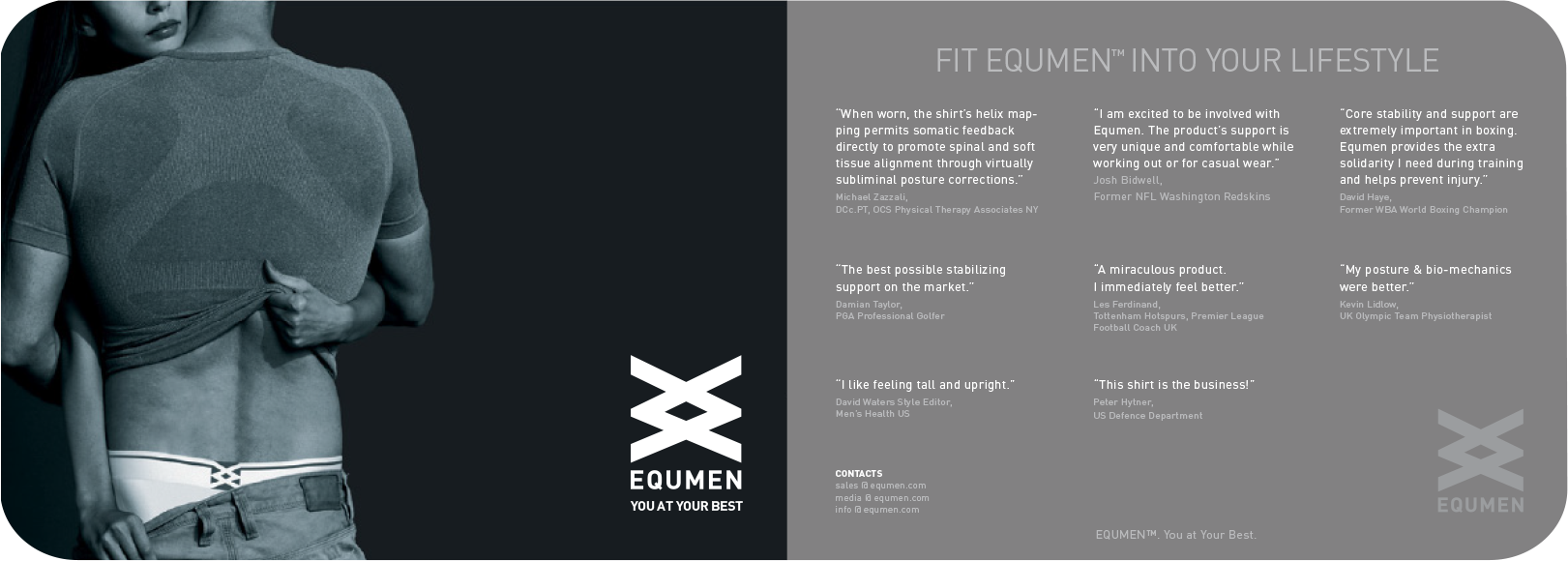 Rooted in proprietary Helix Mapping™ technology and informed by physiotherapy and fashion design, the brand delivers high-performance compression garments that move seamlessly from work to sport, and from street to suit. More than underwear, EQUMEN™ is about standing taller, moving better, and feeling quietly dialed in every day, supporting real men through considered design, functional innovation, and a refined global aesthetic.